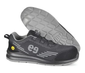 Deportivo de seguridad.Tejido técnico y refuerzos en piel serraje.Puntera y plantilla no metálica.Suela PU/PU.ESD. EN ISO 20345:2022 S3S CI FO SR SC.